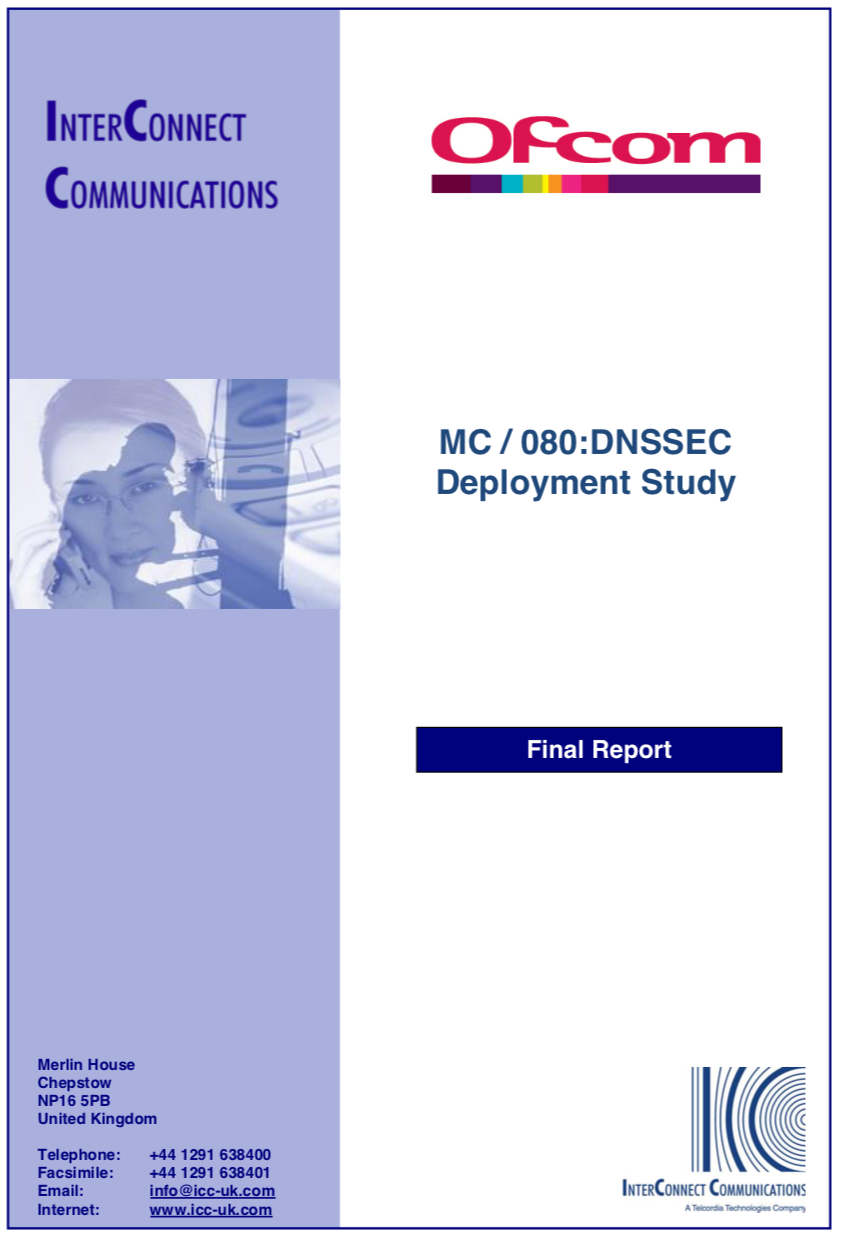 MC/080 Study for Ofcom about DNSSEC Deployment and security the infrastructure of the internet, co-authored with InterConnect Communications